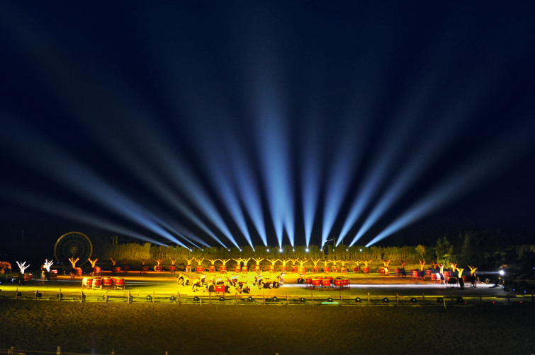 【特点1】演出场地规模宏大,功能多元化。整个演出场地占地约40亩,实景演出场地面积为3000平方米,大大超出了一般舞台的规模,并且演出区域有大片稻田、林带为背景,富有田园气息。