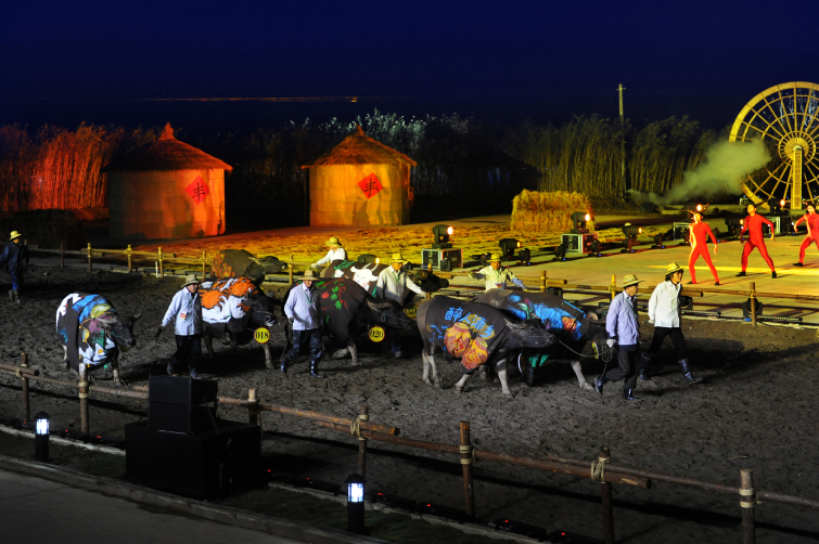 整个活动中可谓是:“牛”味十足:牛鼓舞、牛体彩绘、时尚奶牛、激情奔牛……这些“牛”里“牛”气的环节,将野性与艺术的融合、激情与优雅的碰撞,演绎得淋漓尽致。首次在申城推出的大型实景演出《瀛洲传奇》,讲述崇明岛先人从围海造田拓荒开始到男耕女织、繁衍后代、生生不息……留下了许多属于这个岛屿特有的风土人情的传奇故事,生动再现了农耕文明时期象征任劳任怨、甘为孺子牛的瀛洲精神。