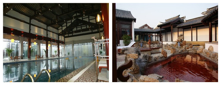 酒店内拥有客房与庭院别墅两种房型。客房有聚福楼、万福楼和祥福楼三种,其中聚福楼是按五星级标准配置,共44间客房;万福楼与祥福楼则按四星级与三星级配置,各有26间与54间,且房间内都为标准间,很适合公司团队使用,而且房间内淋浴设施都有地下温泉特别供给。