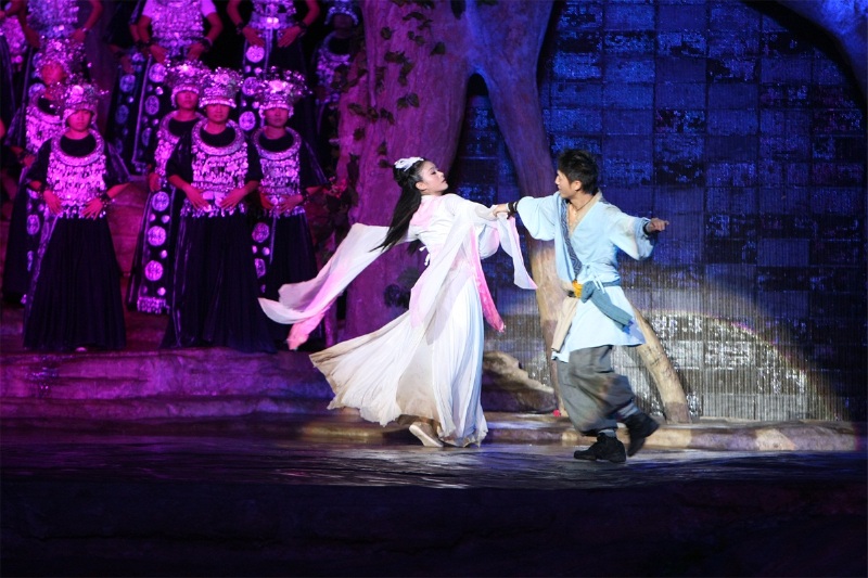 《天门狐仙—新刘海砍樵》的主舞台就与奇峰、峡谷、森林、流瀑溶为一体,共同形成一个纵深数公里、横宽和高差均逾千米、世界唯一的一座高山峡谷大舞台。根据刘海砍樵的故事改编,融入了桑植等地的民歌和土家的民风、民俗,在大型的真实场景中,表演的歌舞剧。以灯光和背景的大型营造以及歌曲独特风格为胜。
