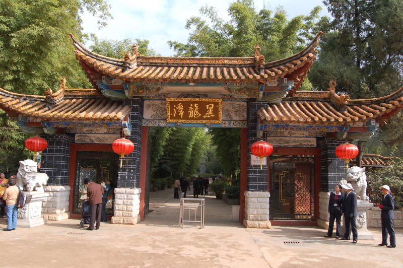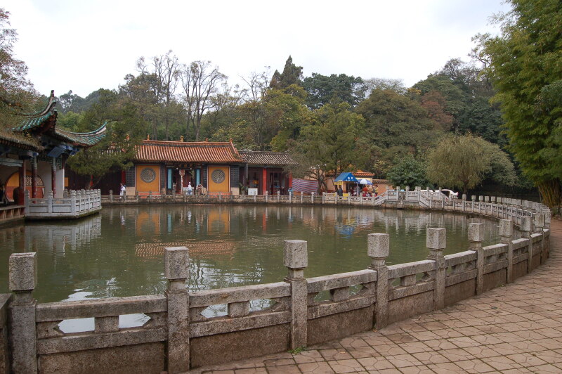 古建筑群绕潭而建,下观即黑龙宫,始建于明洪武二十七年(1394年),供奉着龙王、水族等塑像,传说为兴云降 雨之神。隐于绿荫深处依山而建的为上观龙泉观,即“汉黑水祠”。观中植有被郭沫若为“三异木”的唐梅、宋柏、明茶,以及元杉、清玉兰等,明清时期梅花均汇于此,故至今古梅荟萃, 正如阮元所道:“千岁梅花千尺潭,春风先到彩云南。”