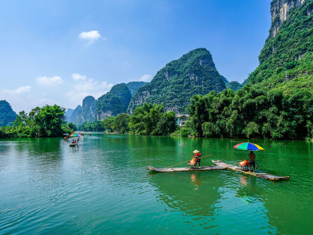 游览【遇龙河双人手撑竹筏漂流】(时间约40分钟,由于水上项目,水流速度不定,具体游览时间以景区实际情况为准)遇龙河是漓江在阳朔境内的一条支流,河水清澈如镜,随手就能拍出山水画般的照片。可以坐筏细细品味沿河秀美的山水田园风光。,与漓江风光相比,这里“不是漓江、胜似漓江”,被央视赞誉为阳朔最美风景。